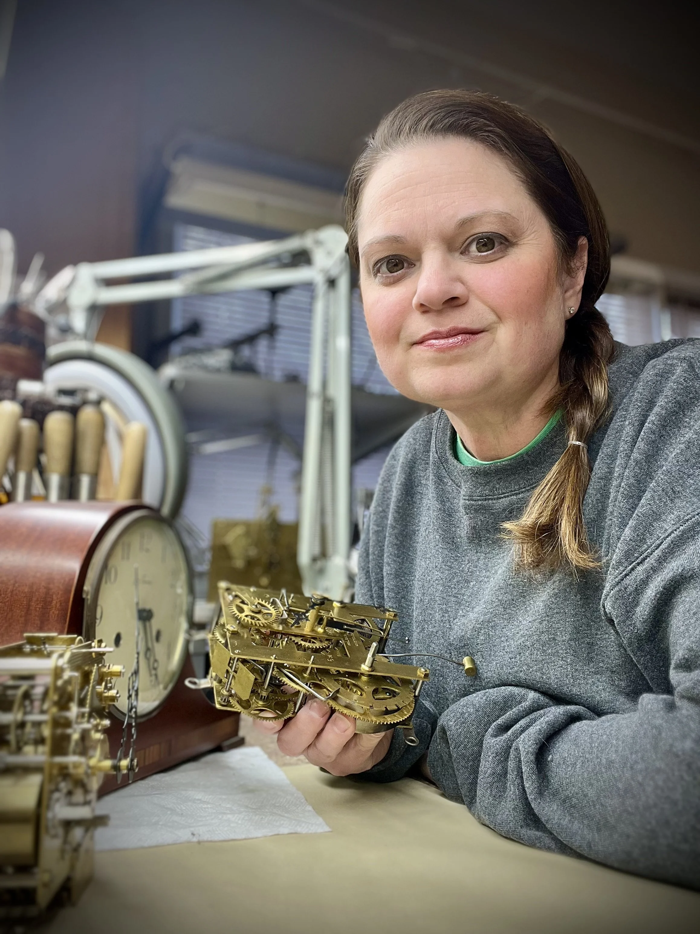 Jennifer was among a nationwide group of subject matter experts competing for the scholarship. Located in Springboro, Ohio, Jennifer transitioned from a 15-year career as a Registered Piano Technician and piano teacher to a full-time clockmaker with a brick-and-mortar business. She has apprenticed under several clockmakers around the country.